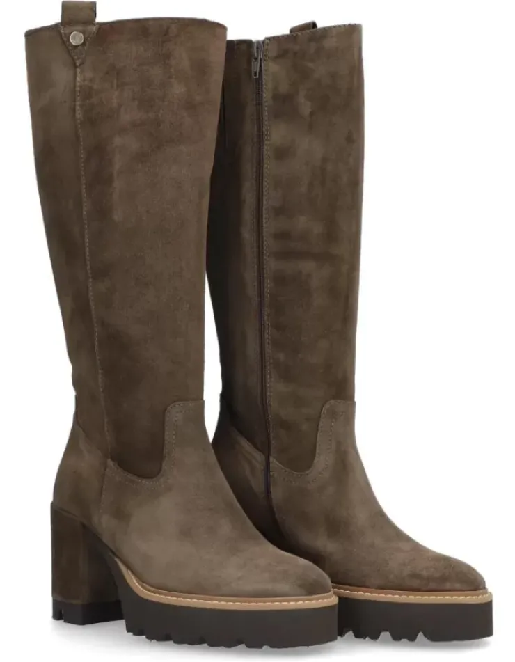 Bota Para Mujer Alpe Colette, Fabricada En Piel (Baby Silk) De Color Kaki Con Tacon De 7 Cm, Suela Antideslizante Y Puntera Redonda, Con Cierre Mediante Cremallera Y Cana Alta.