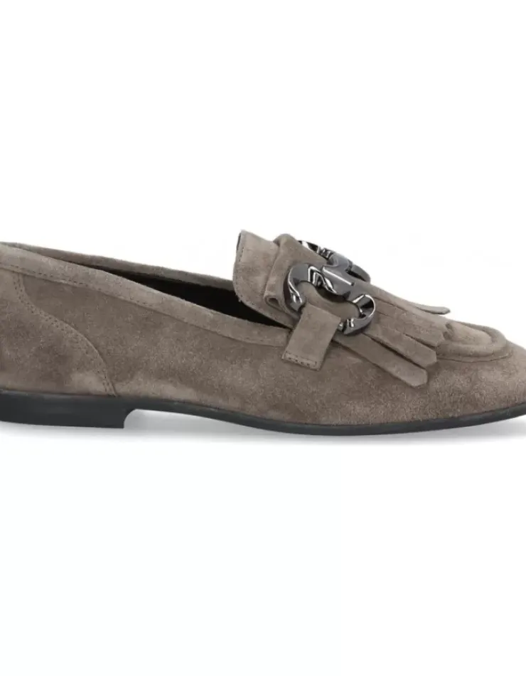 Mocasin Para Mujer Alpe New Roma, Fabricado En Piel (Baby Silk) De Color Taiga Con Tacon De 1 Cm, Suela Antideslizante Y Puntera Cuadrada, Sin Cierre.