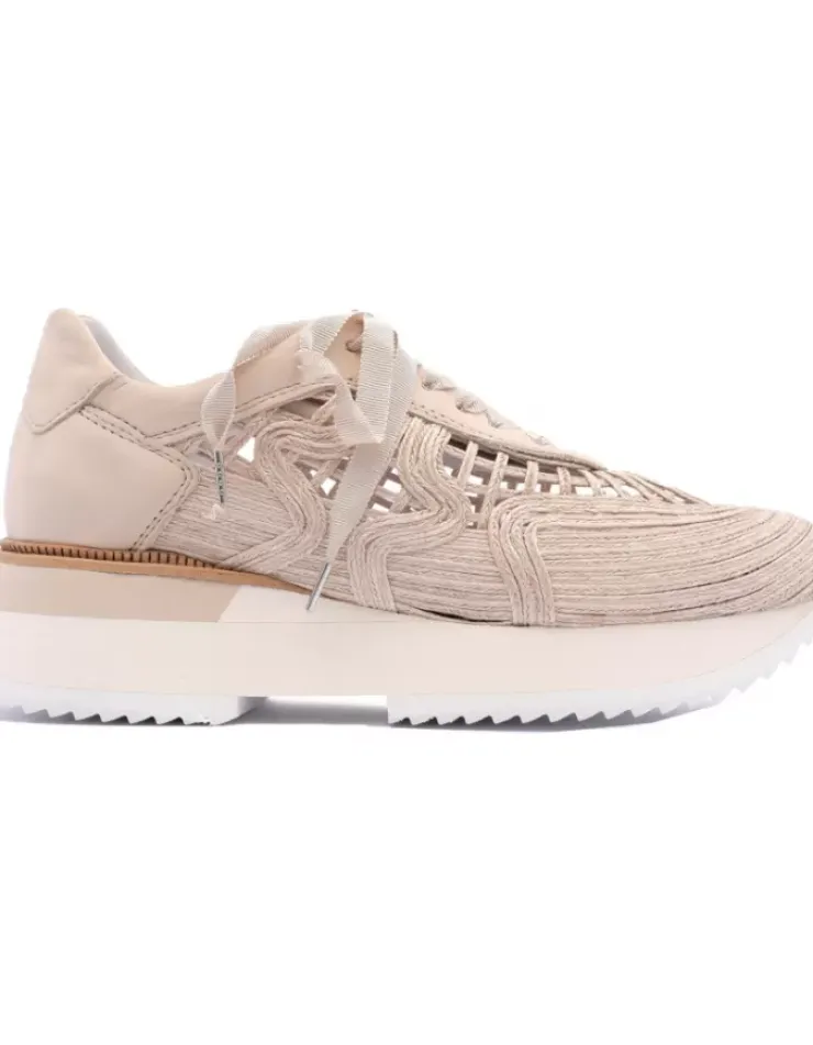 Sneaker Deportivo Para Mujer Alpe Estella, Fabricado En Piel (Rafia) De Color Arena Sin Tacon, Suela Antideslizante Y Puntera Redonda, Con Cierre Mediante Cordon.
