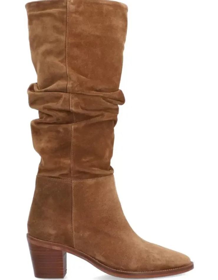 Bota Para Mujer Alpe Nevada, Fabricada En Piel (Baby Silk) De Color Cuero Con Tacon De 6 Cm, Suela Antideslizante Y Puntera Afilada, Sin Cierre Y Cana Alta.