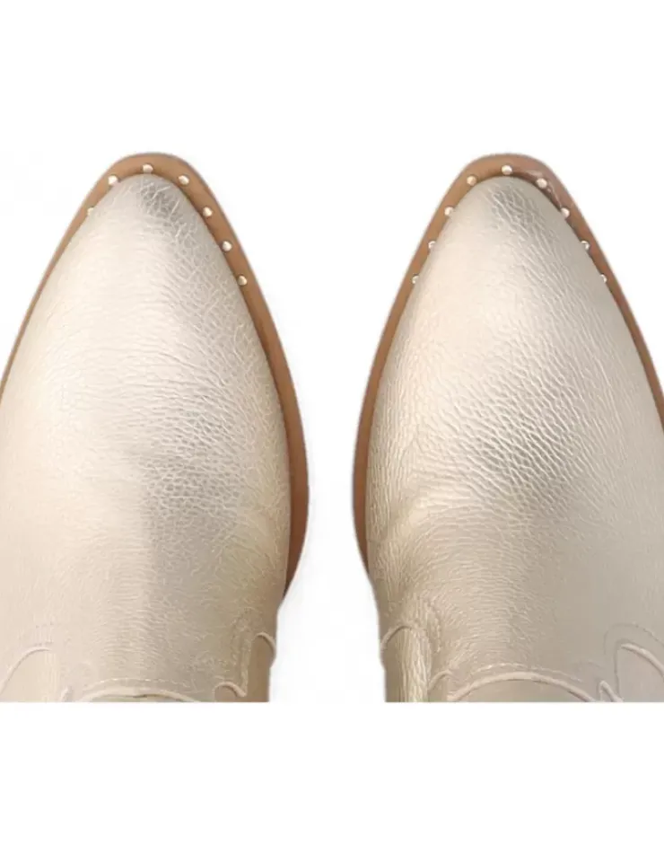 Botin Para Mujer Alpe Claire, Fabricado En Piel (Gibson) De Color Platino Con Tacon De 4 Cm, Suela Antideslizante Y Puntera Afilada, Con Cierre Mediante Cremallera Y Cana Baja.