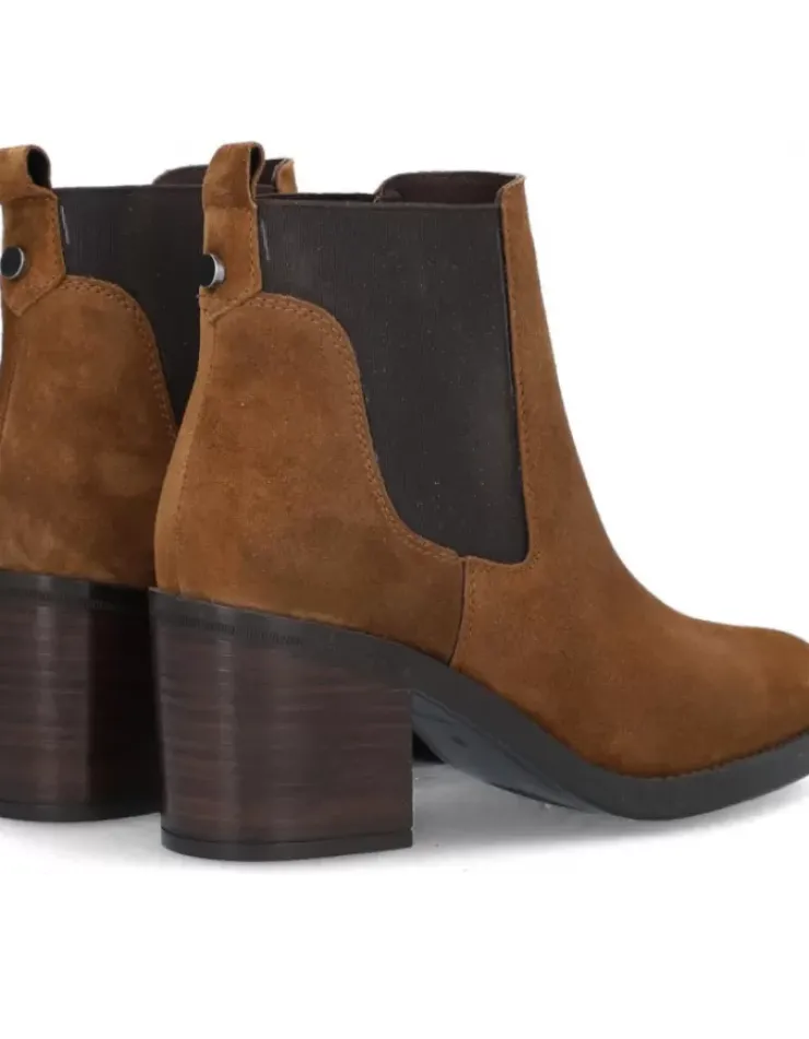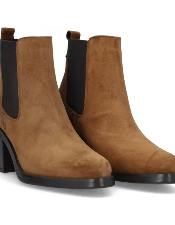 Botin Para Mujer Alpe Leyna, Fabricado En Piel (Baby Silk) De Color Cuero Con Tacon De 7 Cm, Suela Antideslizante Y Puntera Redonda, Sin Cierre Y Cana Baja.