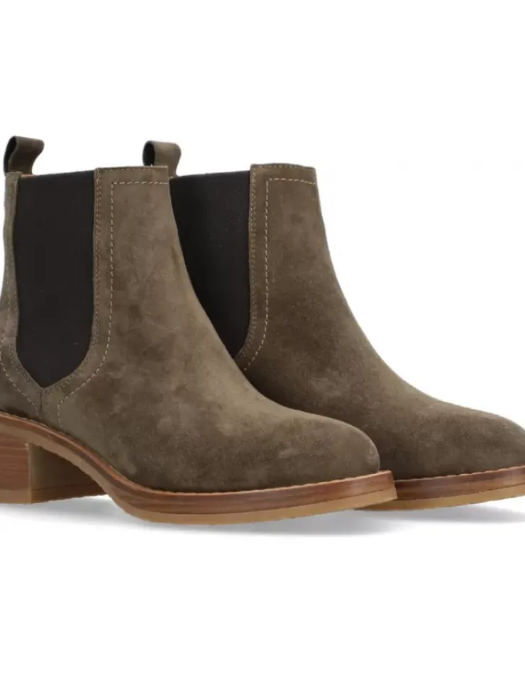 Botin Para Mujer Alpe Madame, Fabricado En Piel (Baby Silk) De Color Kaki Con Tacon De 5 Cm, Suela Antideslizante Y Puntera Redonda, Sin Cierre Y Cana Baja.