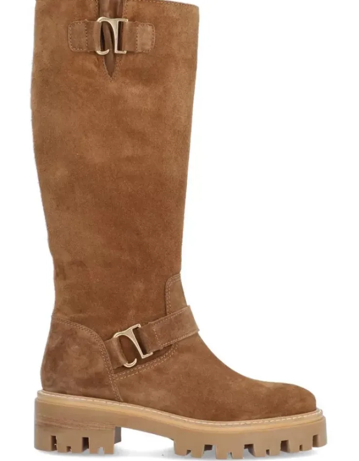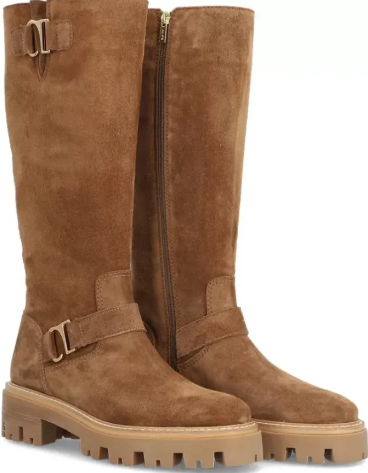 Bota Para Mujer Alpe Monza, Fabricada En Piel (Baby Silk) De Color Cuero Con Tacon De 5 Cm, Suela Antideslizante Y Puntera Redonda, Con Cierre Mediante Cremallera Y Cana Alta.