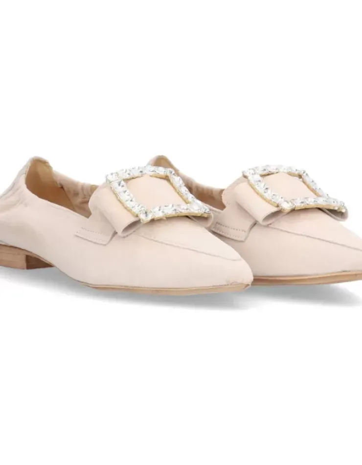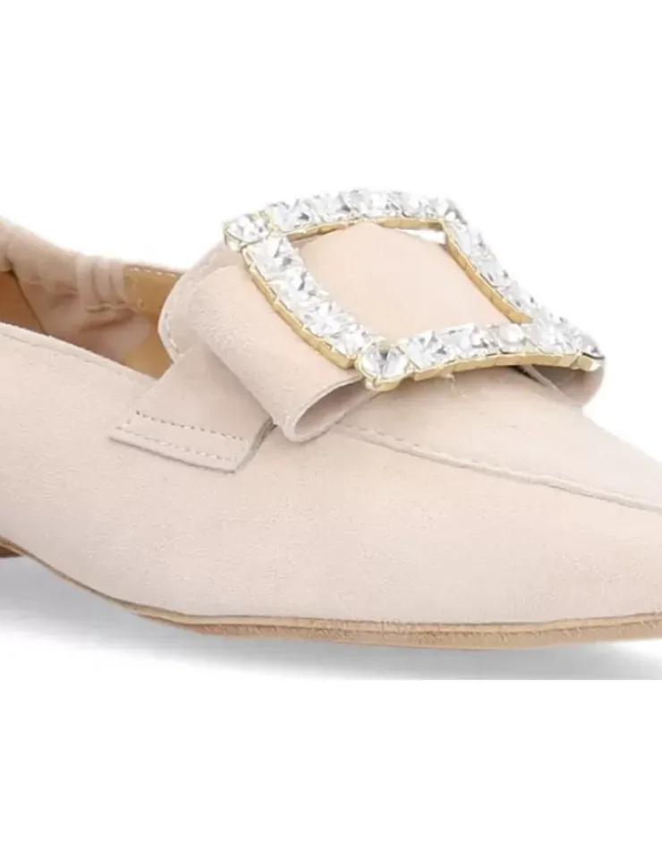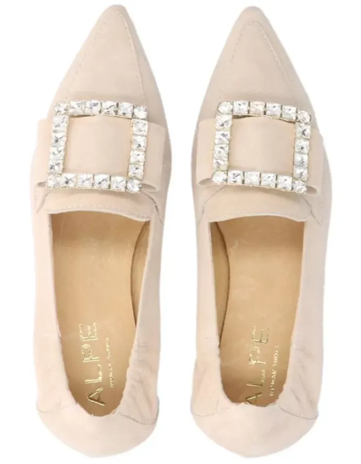 Mocasin Para Mujer Alpe Niza, Fabricado En Piel (Ante) De Color Arena Con Tacon De 1 Cm, Suela Antideslizante Y Puntera Afilada, Sin Cierre.