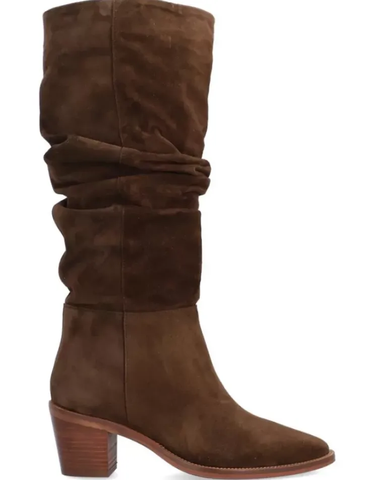 Bota Para Mujer Alpe Nevada, Fabricada En Piel (Baby Silk) De Color Arabica Con Tacon De 6 Cm, Suela Antideslizante Y Puntera Afilada, Sin Cierre Y Cana Alta.