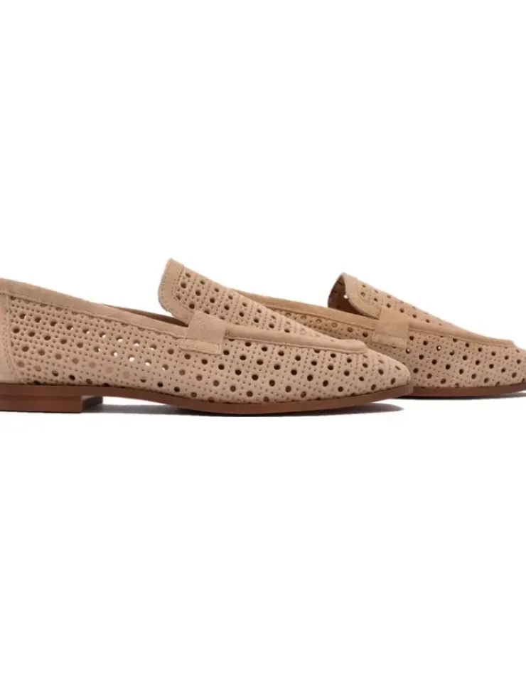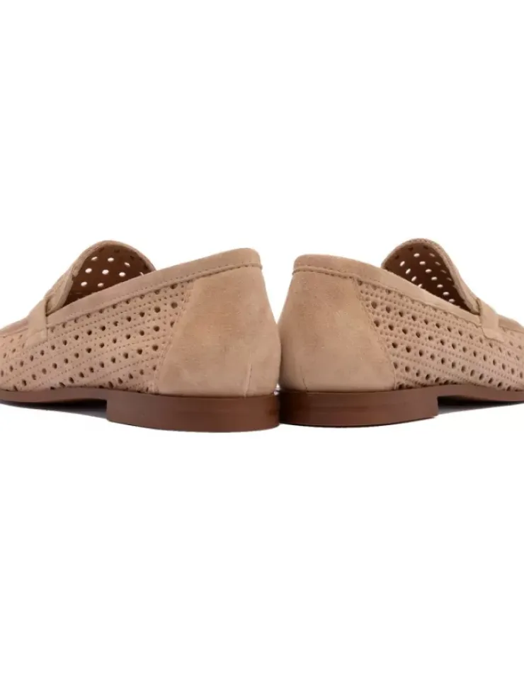 Mocasin Para Mujer Alpe New Roma, Fabricado En Piel (Baby Silk) De Color Arena Con Tacon De 1 Cm, Suela Antideslizante Y Puntera Cuadrada, Sin Cierre.