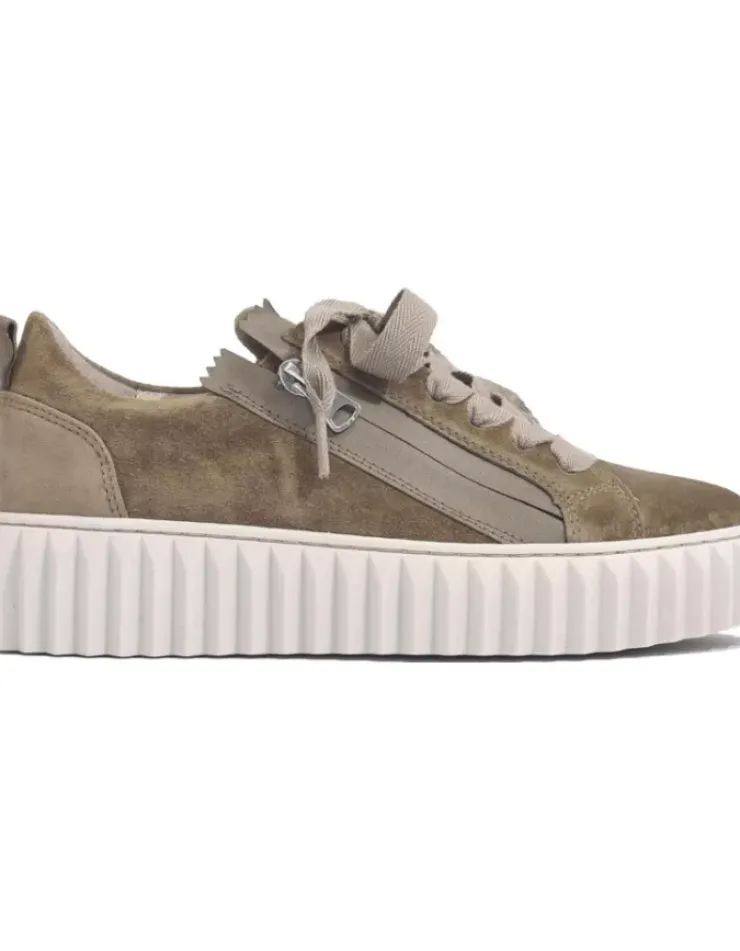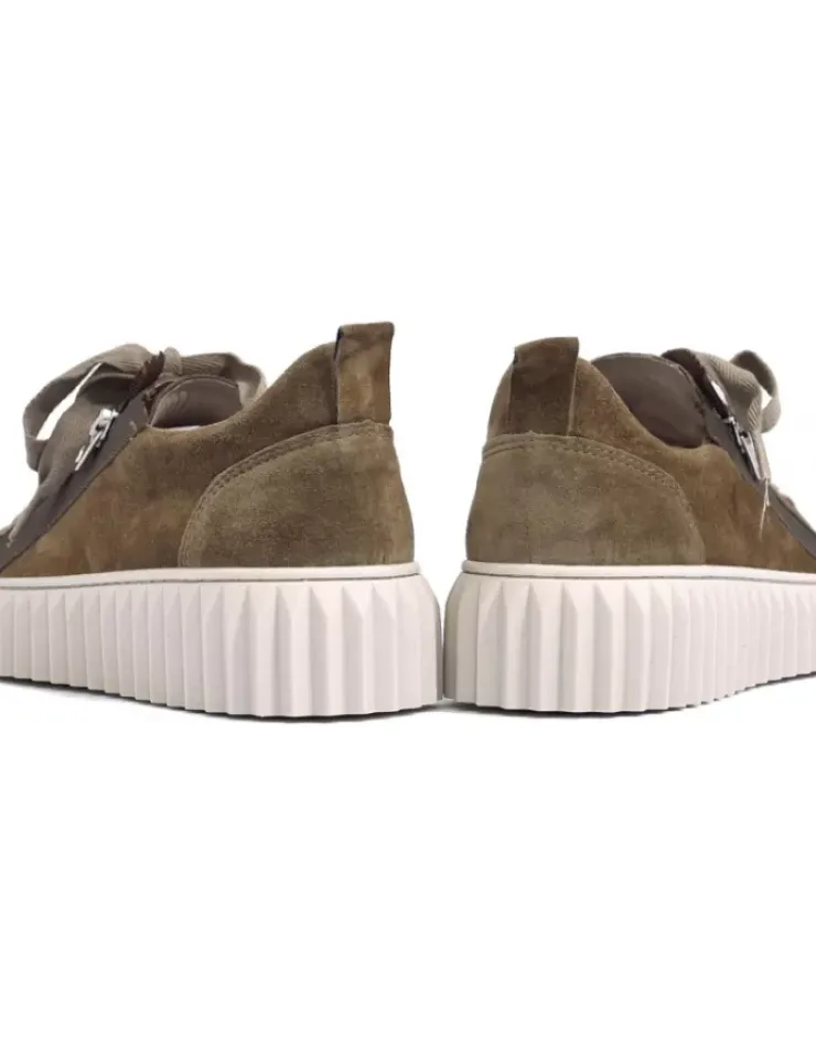 Sneaker Casual Para Mujer Alpe Alba, Fabricado En Piel (Baby Silk) De Color Kaki Sin Tacon, Suela Antideslizante Y Puntera Redonda, Con Cierre Mediante Cordon.