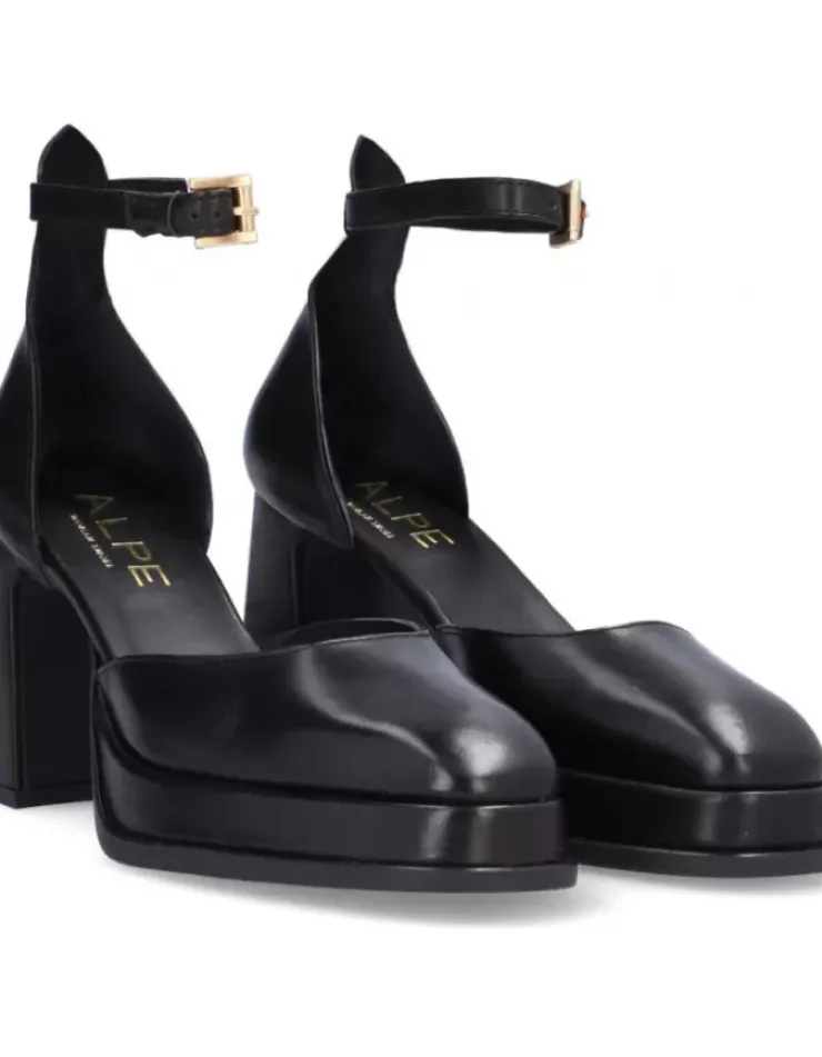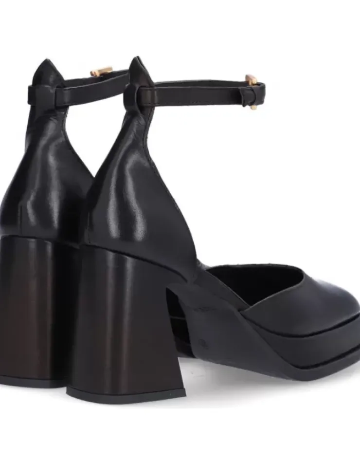 Zapato Para Mujer Alpe Idanna, Fabricado En Piel (Becerro) De Color Negro Con Tacon De 8,5 Cm, Suela Antideslizante Y Puntera Cuadrada, Con Cierre Mediante Hebilla.