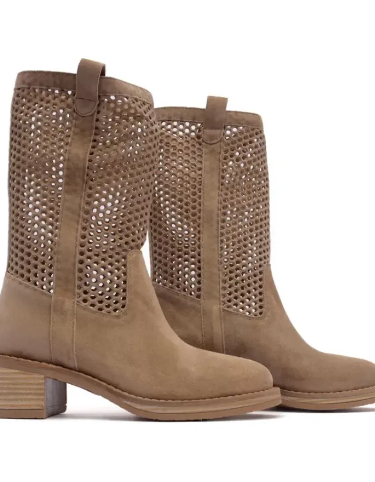 Bota Para Mujer Alpe Madame, Fabricada En Piel (Baby Silk) De Color Dessert Con Tacon De 5 Cm, Suela Antideslizante Y Puntera Redonda, Sin Cierre Y Cana Media.