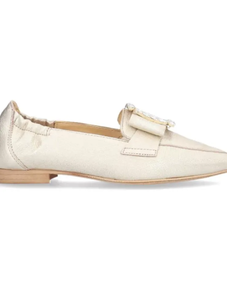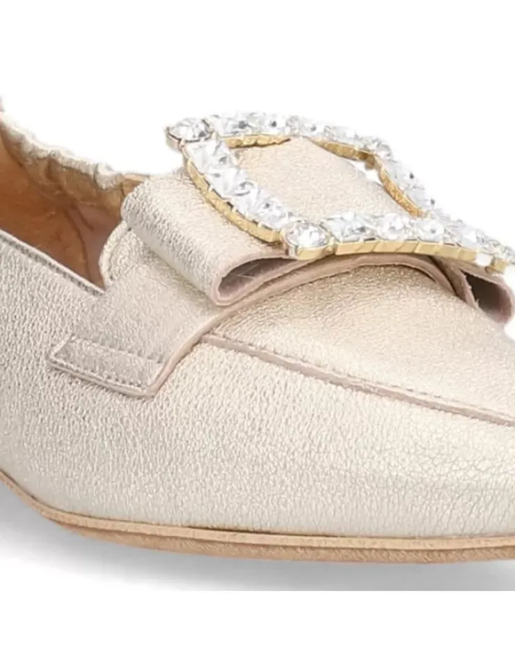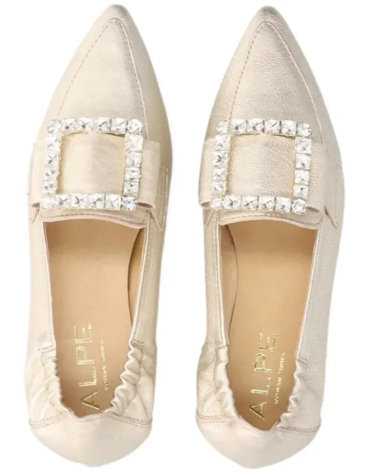 Mocasin Para Mujer Alpe Niza, Fabricado En Piel (Saffron) De Color Platino Con Tacon De 1 Cm, Suela Antideslizante Y Puntera Afilada, Sin Cierre.