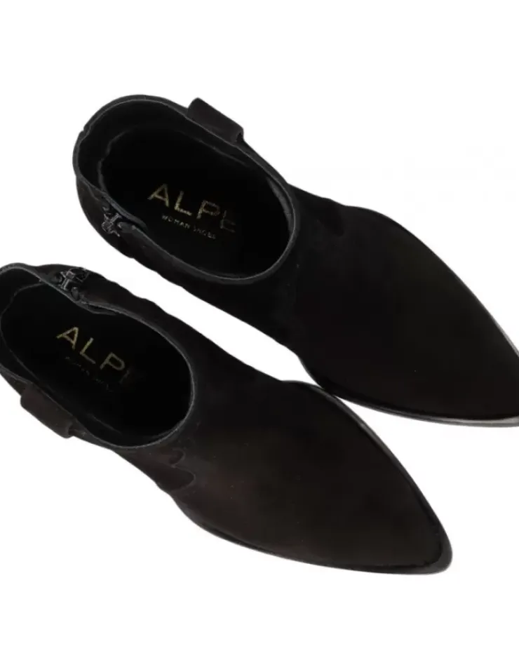 Botin Para Mujer Alpe Western, Fabricado En Piel (Baby Silk) De Color Negro Con Tacon De 4,5 Cm, Suela Antideslizante Y Puntera Afilada, Con Cierre Mediante Cremallera Y Cana Baja.