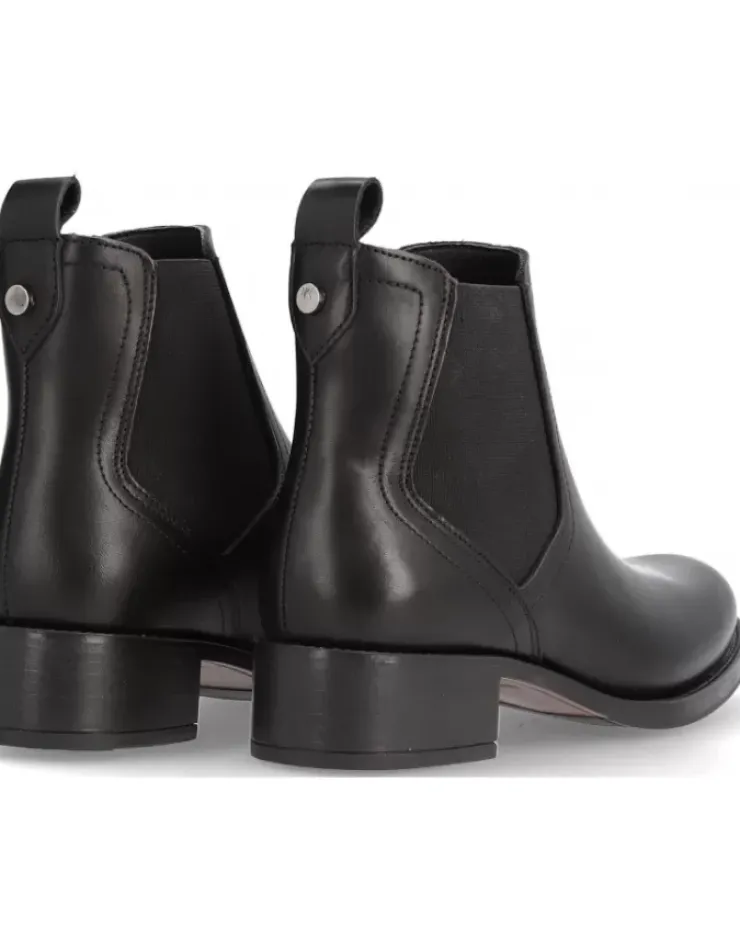 Botin Para Mujer Alpe Alain-2, Fabricado En Piel (Becerro) De Color Negro Con Tacon De 3,5 Cm, Suela Antideslizante Y Puntera Redonda, Sin Cierre Y Cana Baja.