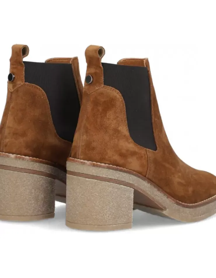 Botin Para Mujer Alpe Janis, Fabricado En Piel (Baby Silk) De Color Cuero Con Tacon De 7,5 Cm, Suela Antideslizante Y Puntera Redonda, Sin Cierre Baja.