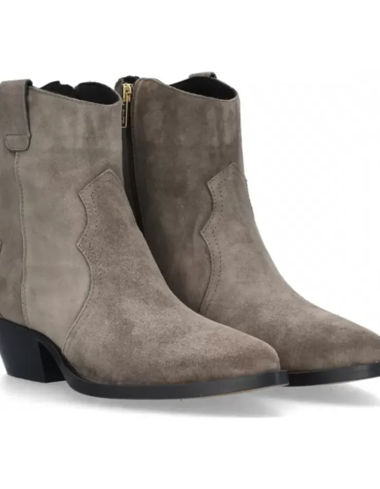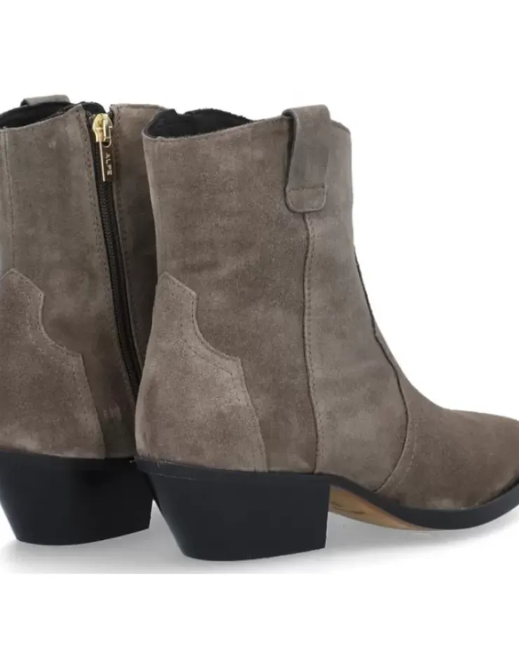 Botin Para Mujer Alpe Western, Fabricado En Piel (Baby Silk) De Color Taiga Con Tacon De 4,5 Cm, Suela Antideslizante Y Puntera Afilada, Con Cierre Mediante Cremallera Y Cana Baja.