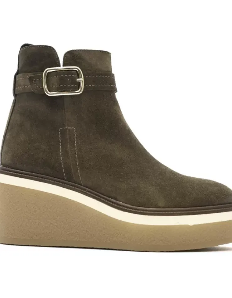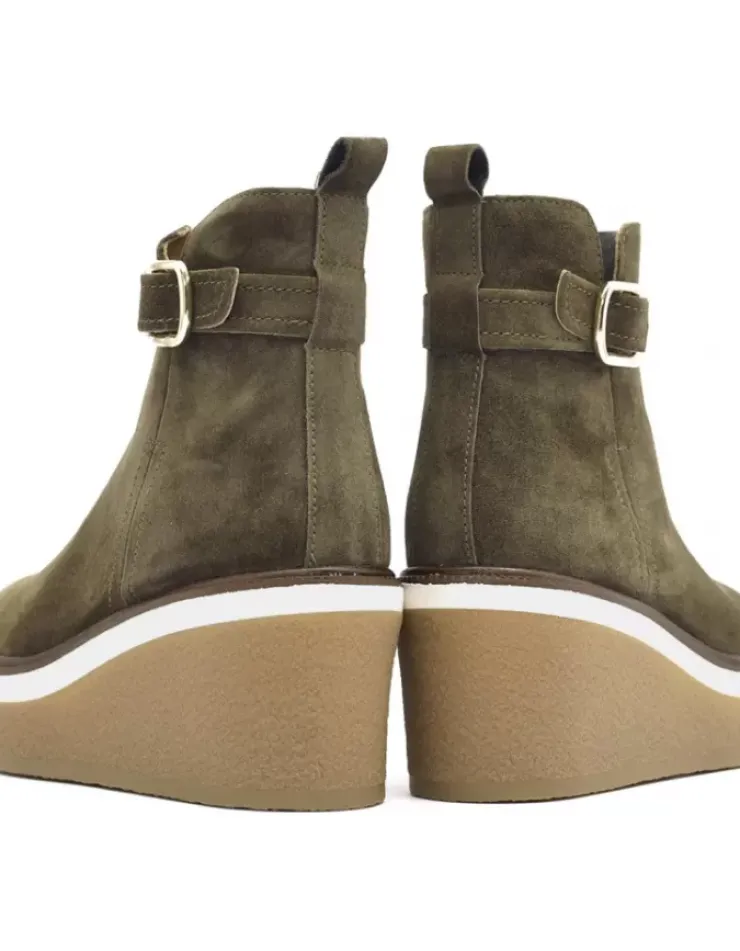 Botin Para Mujer Alpe Kiara, Fabricado En Piel (Baby Silk) De Color Olive Sin Tacon, Suela Antideslizante Y Puntera Redonda, Con Cierre Mediante Cremallera Y Cana Baja.
