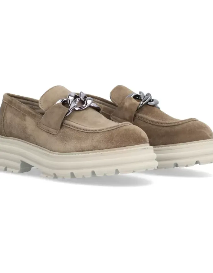 Zapato Para Mujer Alpe Alabama, Fabricado En Piel (Baby Silk) De Color Sander Con Tacon De 5 Cm, Suela Antideslizante Y Puntera Redonda, Sin Cierre.