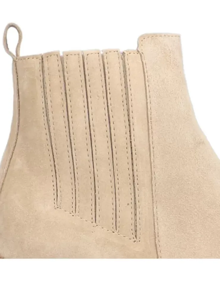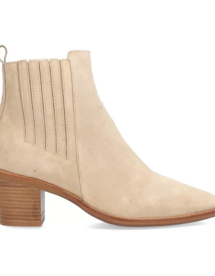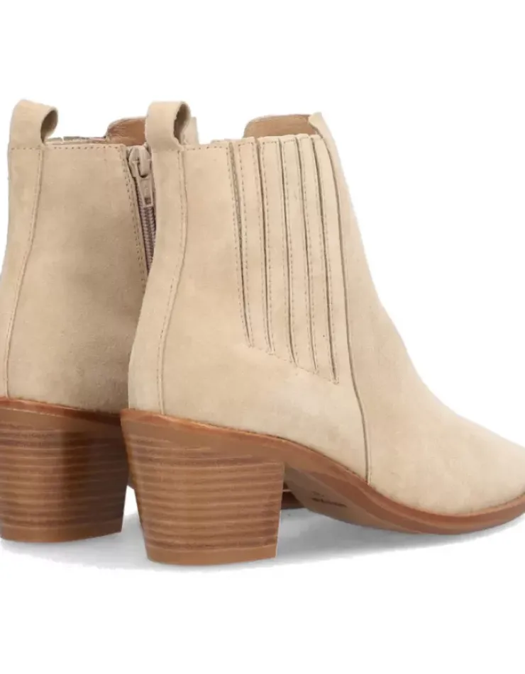Botin Para Mujer Alpe Nevada, Fabricado En Piel (Baby Silk) De Color Arena Con Tacon De 5,5 Cm, Suela Antideslizante Y Puntera Afilada, Con Cierre Mediante Cremallera Y Cana Baja.