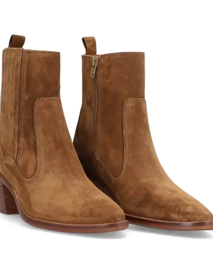Botin Para Mujer Alpe Nevada, Fabricado En Piel (Baby Silk) De Color Cuero Con Tacon De 6 Cm, Suela Antideslizante Y Puntera Afilada, Con Cierre Mediante Cremallera Y Cana Baja.